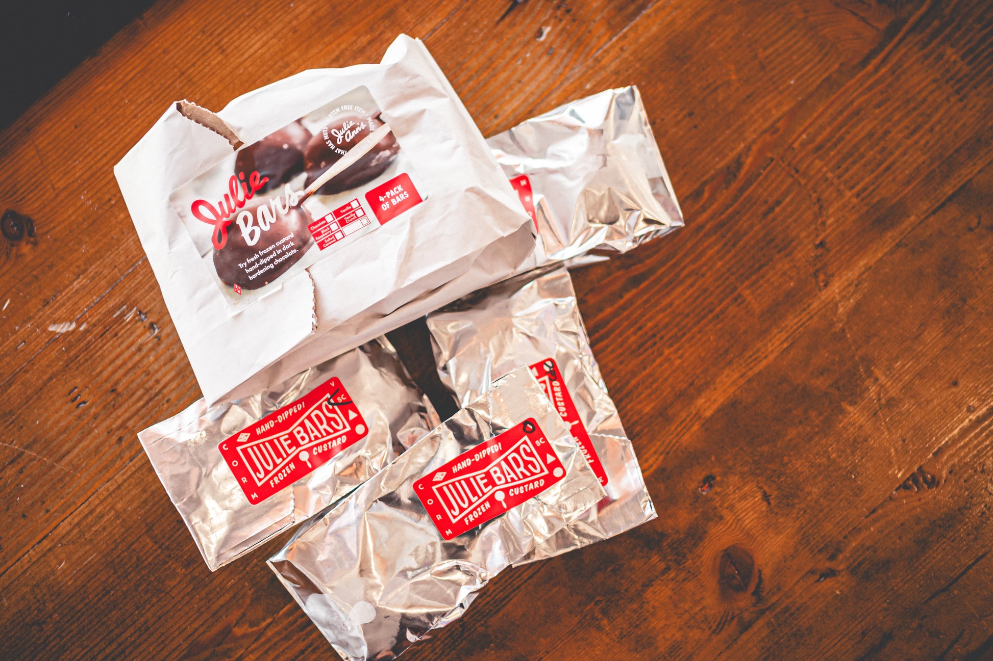 Our frozen Julie Bars should be kept frozen until serving. Although they are individually wrapped in double-walled foil bags, they taste best frozen.