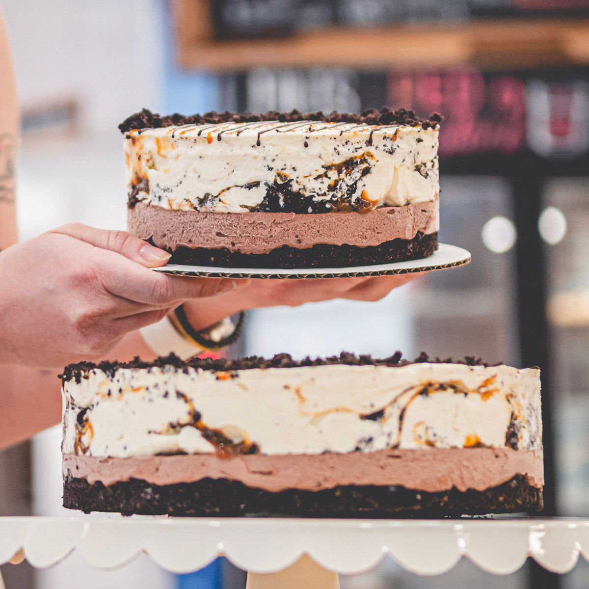 This popular supreme (no cake, just layers of custard and topping) has a crunchy bottom layer of our chocolate cocoa crumble and a thin layer of chocolate custard. We top it off with a thick layer of vanilla custard mixed with salted caramel and more cookie crumble, along with a decorative drizzle of chocolate ganache and salted caramel.